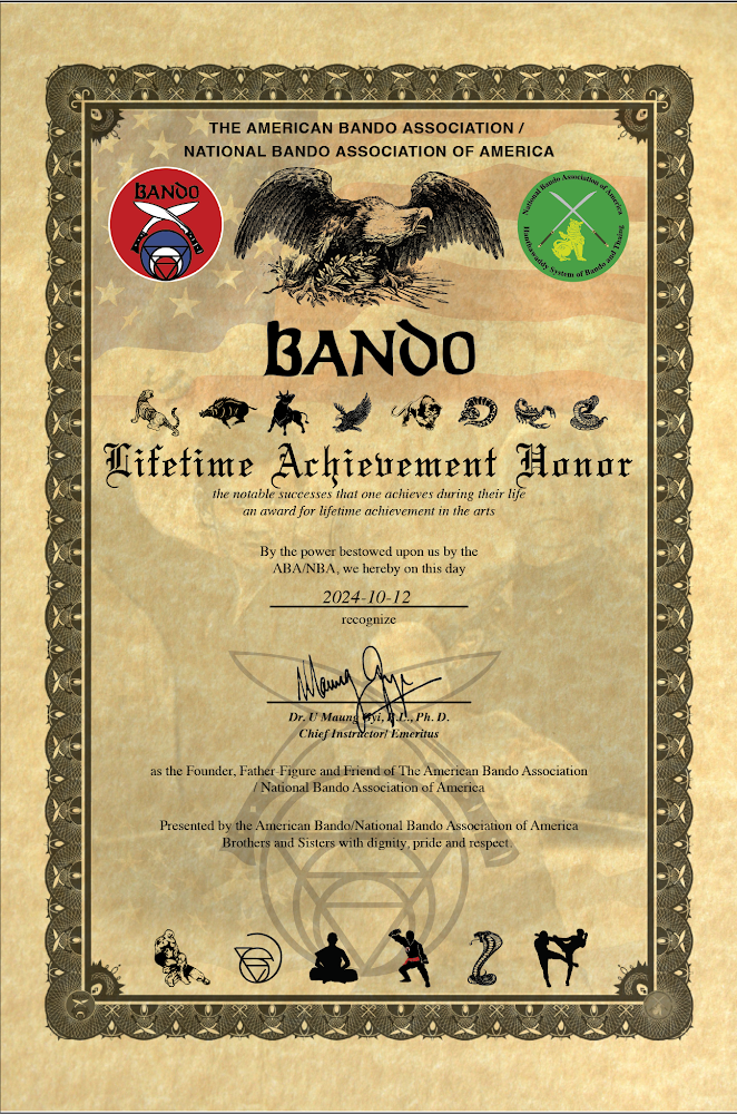 The American Bando Association/National Bando Association of America (ABA/NBAA) is a non-profit organization dedicated to honoring American Veterans and to the preservation of the Hanthawaddy Bando martial arts that originated in Burma (known today as Myanmar).