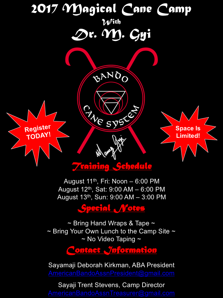 The ABA Magical Cane Campwill be held in Stroud’s Run State Park in Athens, Ohio. This is a special opportunity to train with Dr Gyi in this ancient system that still has relevance today. Here are links to: